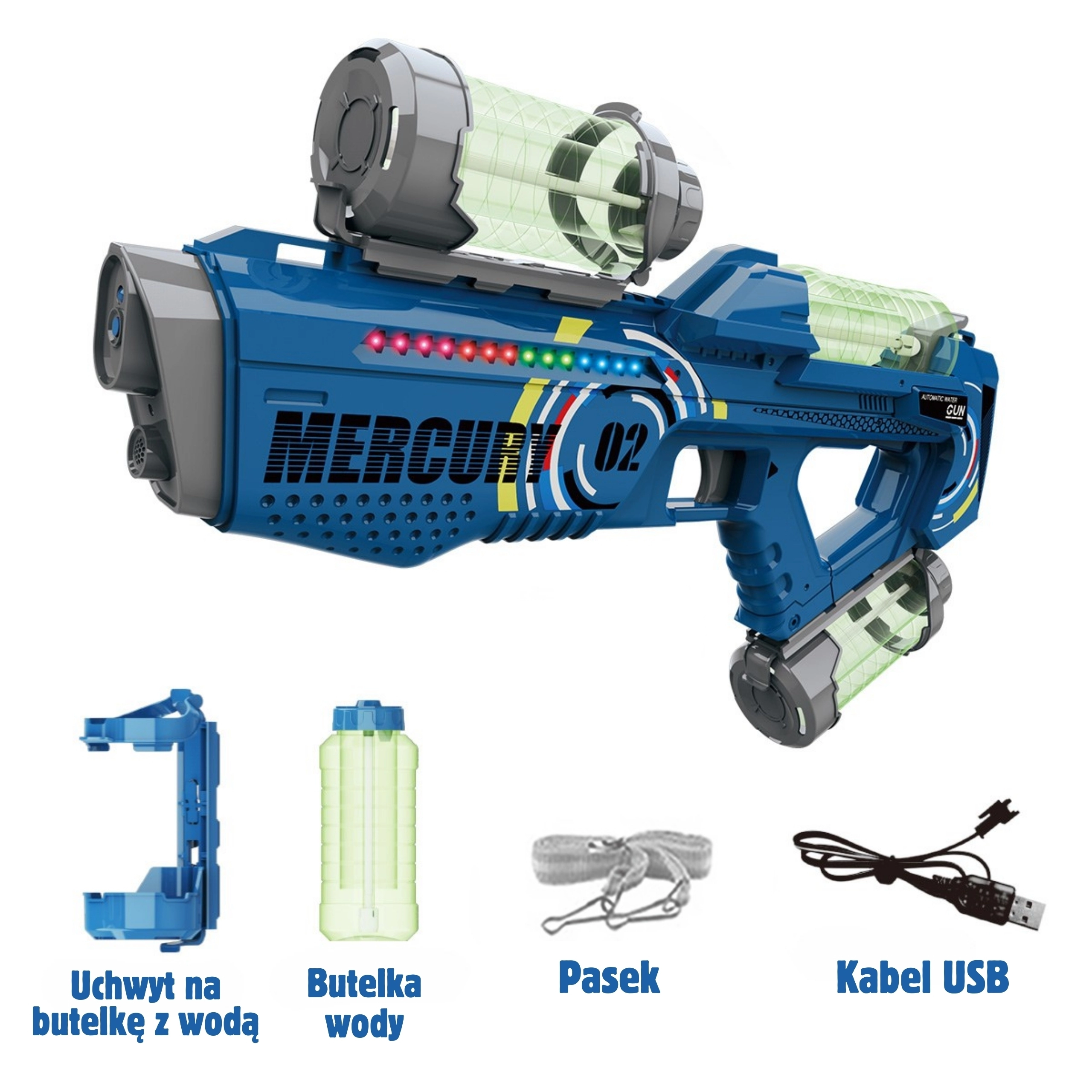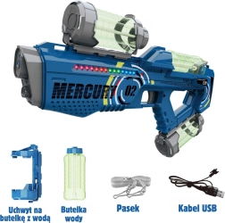- MERCURY 02 water gun, 3 tanks, USB cable, shoulder strap, manual