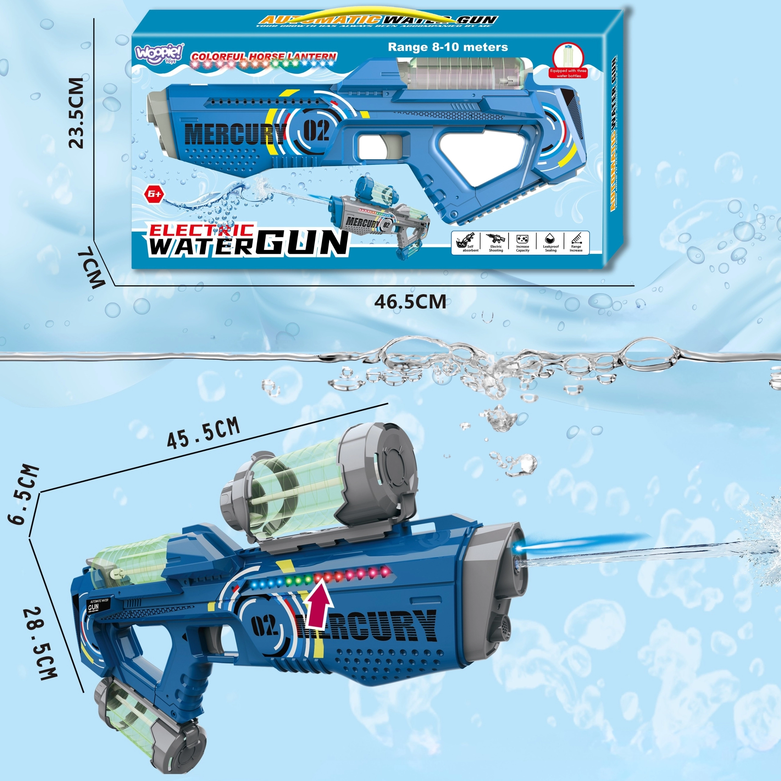 Enjoy summer to the fullest with the WOOPIE MERCURY 02 electric water gun! It offers automatic spraying without pumping, a powerful 2200 mAh battery, 3 interchangeable water tanks, and USB charging. A great choice for kids 6+ and adults alike—perfect for the yard, the beach, and playful battles.