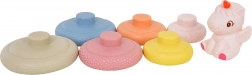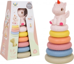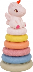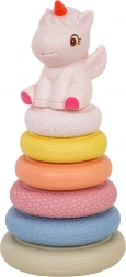 This eco sensory pyramid is an ideal first toy for little explorers. Six easy-to-grip rings with different surfaces teach children to distinguish shapes and textures, support color perception, and naturally lead to practicing grasping and size-order stacking. The cute unicorn on top squeaks when pressed, boosting attention and motivating further exploration.