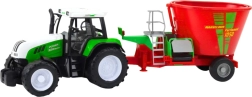 - Green-and-white tractor, red trailer with mixer