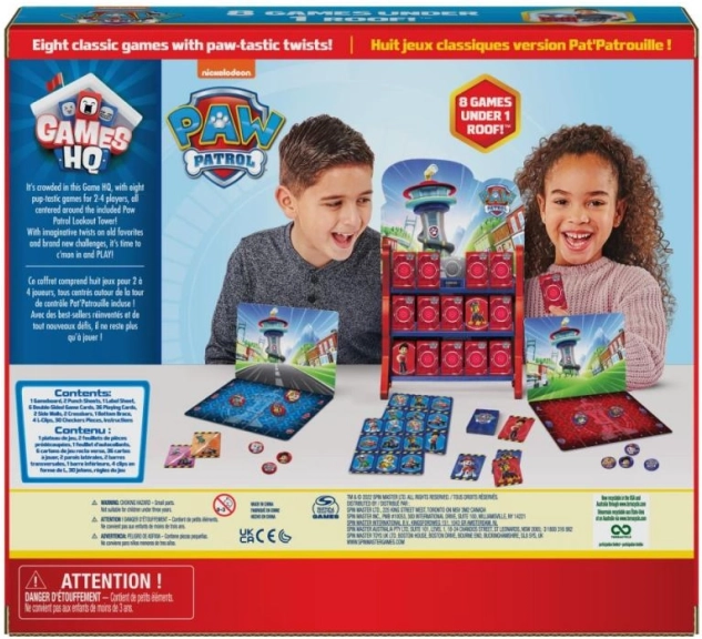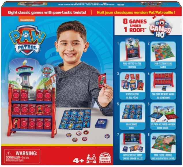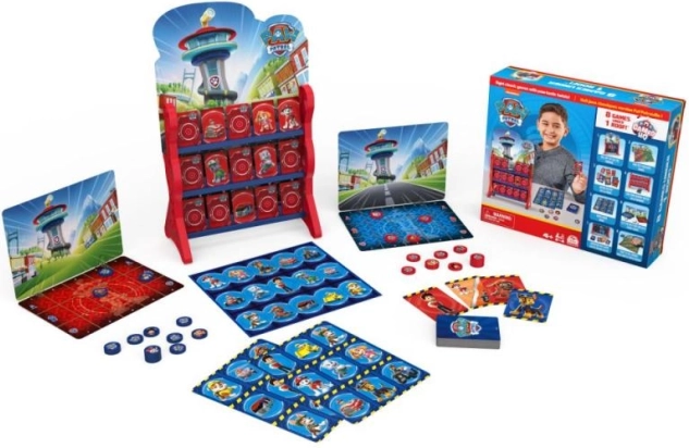 Enjoy family fun with a set of eight classic games in the unique 3D style of the Paw Patrol headquarters. Includes bingo, tic-tac-toe, checkers, and more simple games for 2–4 players ages 4 and up that develop logic, focus, and teamwork.