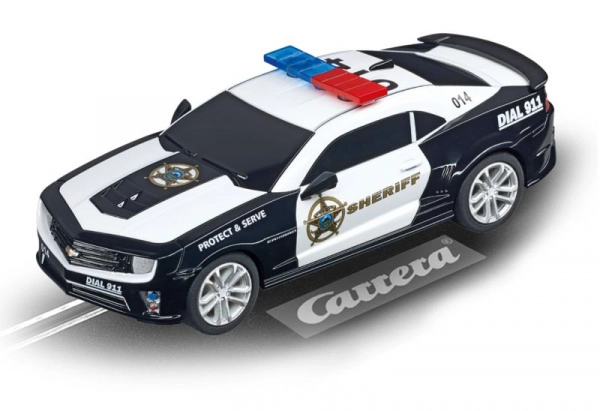 Enjoy action-packed racing with the CHEVROLET Camaro Sheriff model for GO!!! and GO!!! Plus slot car tracks in 1:43 scale. The car features dual contact brushes, a magnet for better grip, a guide blade, and a working light bar for an even more realistic racing experience.
