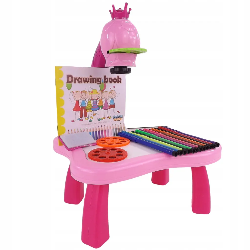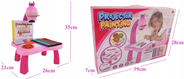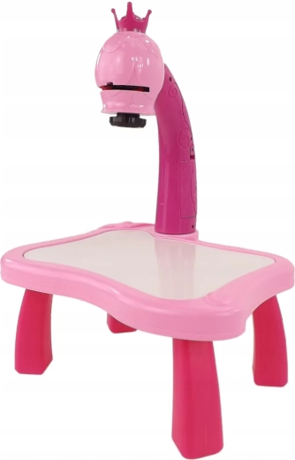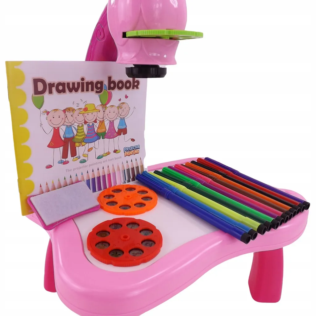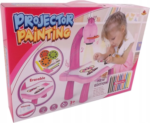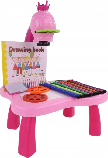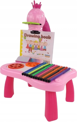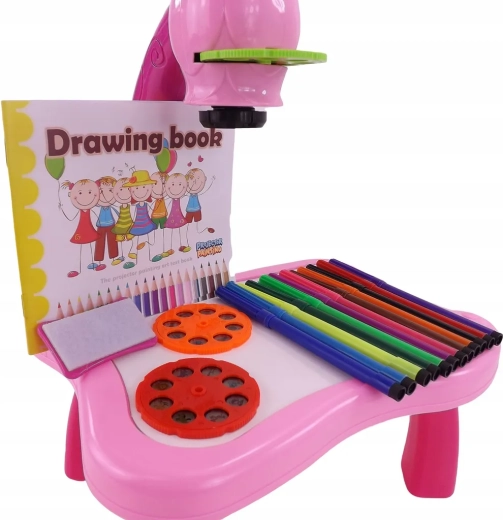 The drawing projector on a pink table projects images onto paper, making it easy for kids to learn drawing and coloring. Includes 3 interchangeable discs with animals, vehicles, fruit and vegetables (a total of 24 templates), colored markers, and a pad. Adjustable focus, 12 melodies, and a night light function support creativity, concentration, and fine motor skills for children aged 3+.