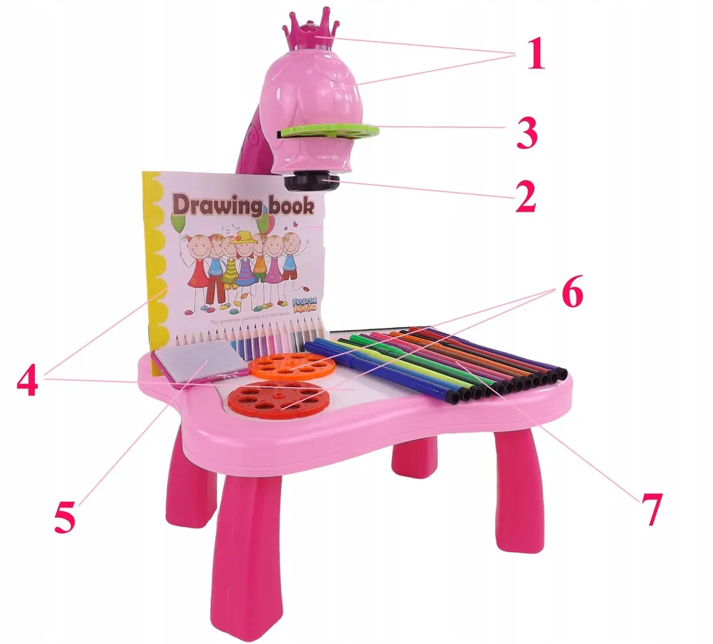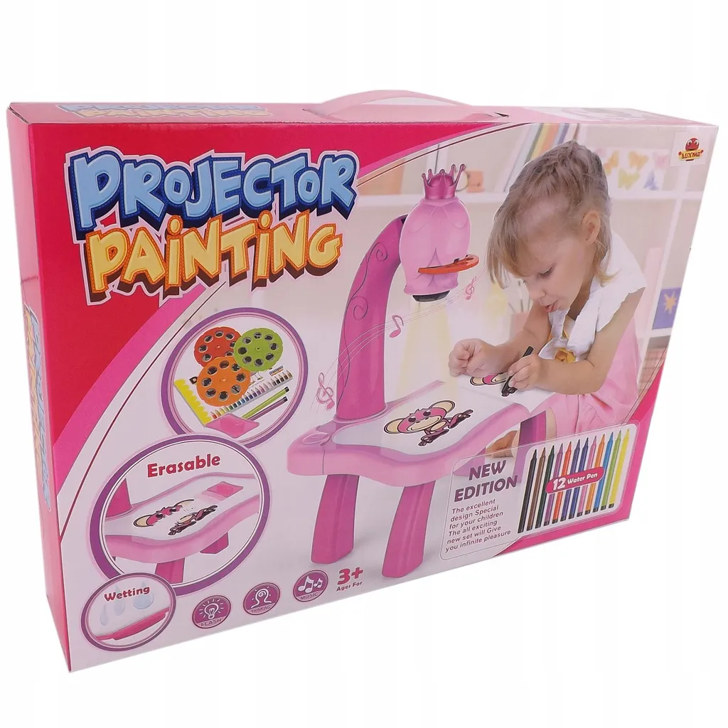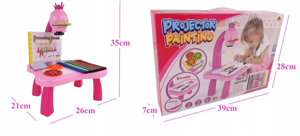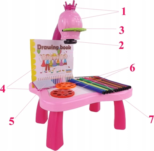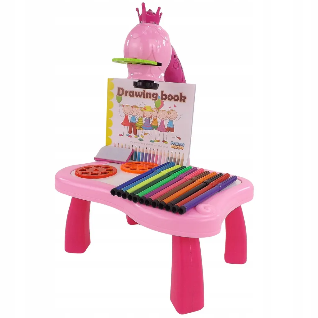 The drawing projector on a pink table projects images onto paper, making it easy for kids to learn drawing and coloring. Includes 3 interchangeable discs with animals, vehicles, fruit and vegetables (a total of 24 templates), colored markers, and a pad. Adjustable focus, 12 melodies, and a night light function support creativity, concentration, and fine motor skills for children aged 3+.