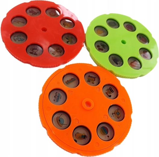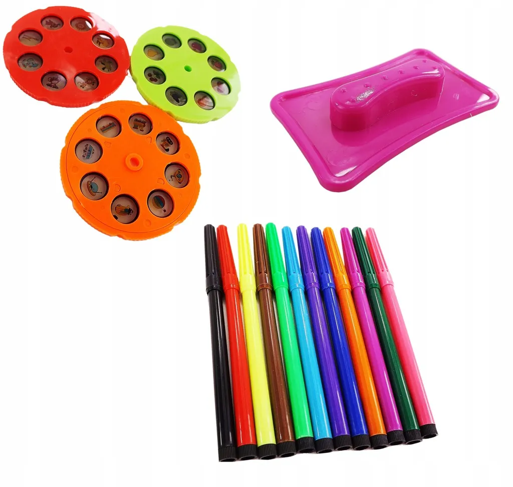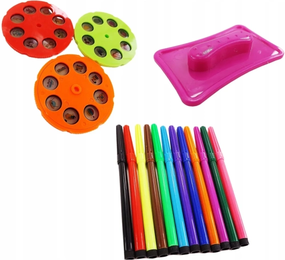 The set includes 3 replaceable discs (each with 8 motifs) grouped by theme: animals, vehicles, and fruit and vegetables—together 24 templates for endless creativity. Thanks to the 12 built-in melodies, your child can draw with music or in silence, and the projector can also serve as a night light.