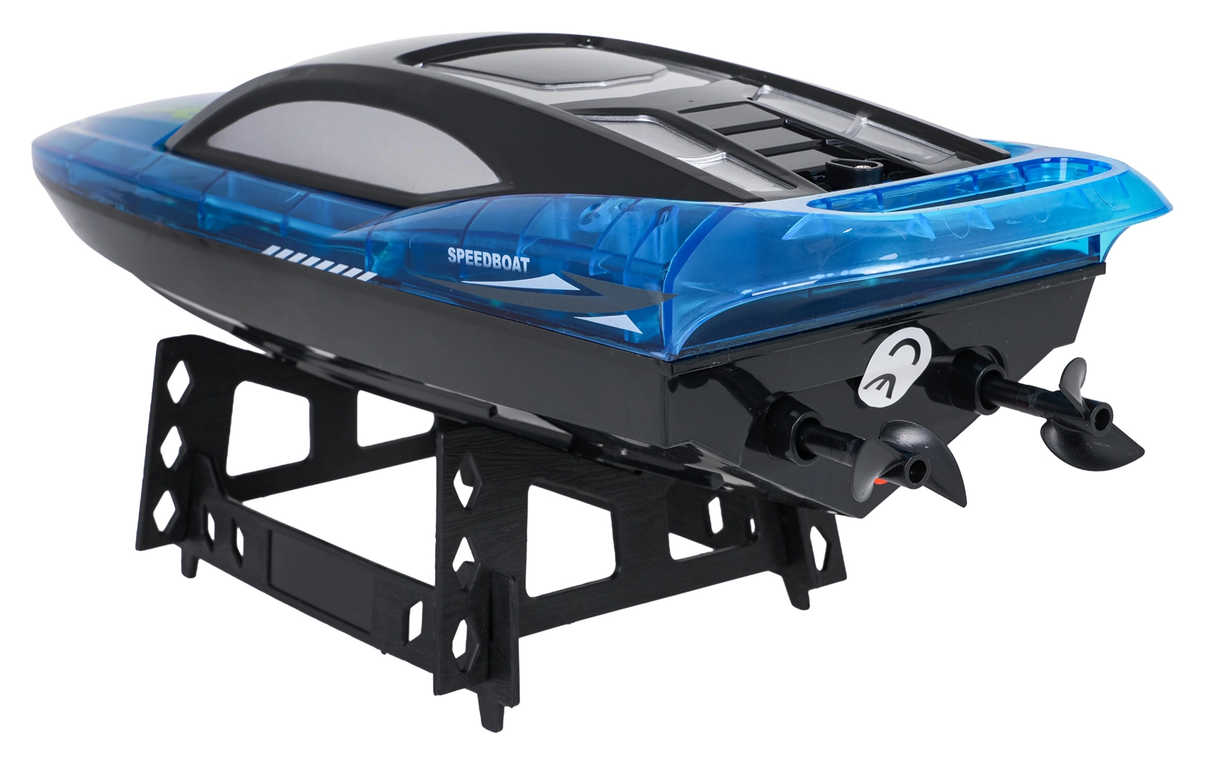 A pair of rear propellers and rudders deliver brisk acceleration and precise turning forward and backward—ideal for racing in a pool or on a pond.
