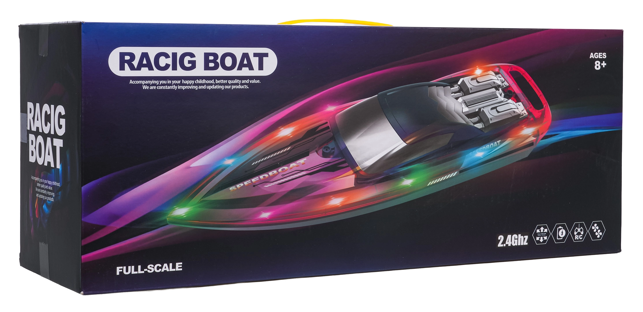 Experience adrenaline on the water with this fast RC racing boat for kids aged 8+. With 2.4 GHz control, LED lighting, and a water-activation safety sensor, the ride is both fun and safe. A durable build and sleek, aerodynamic design ensure stability and high speed. The package includes a rechargeable battery, USB cable, spare propellers, and a practical stand.