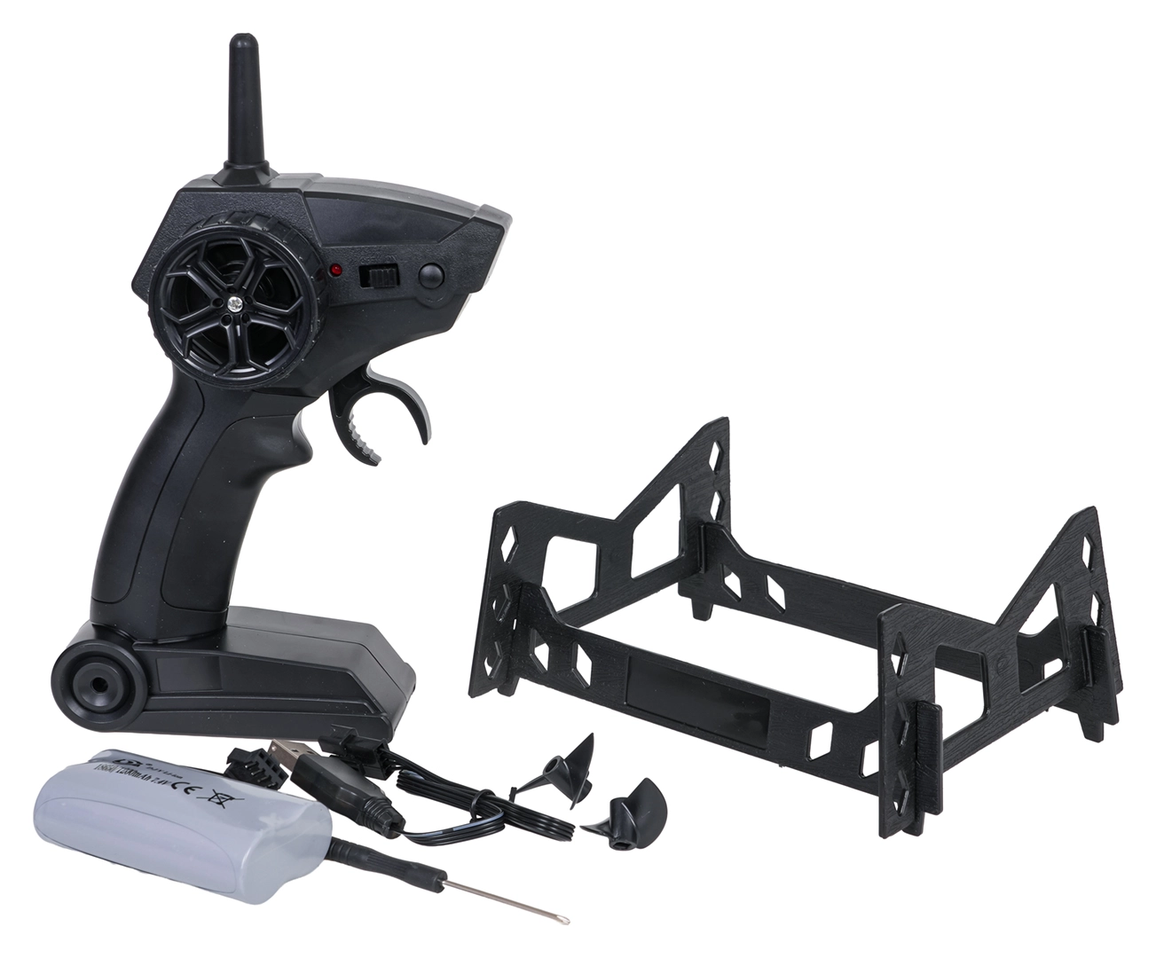 - Boat, 2.4 GHz remote controller, battery, USB charging cable, 2× spare propeller, screwdriver, boat stand, manual