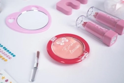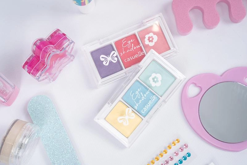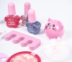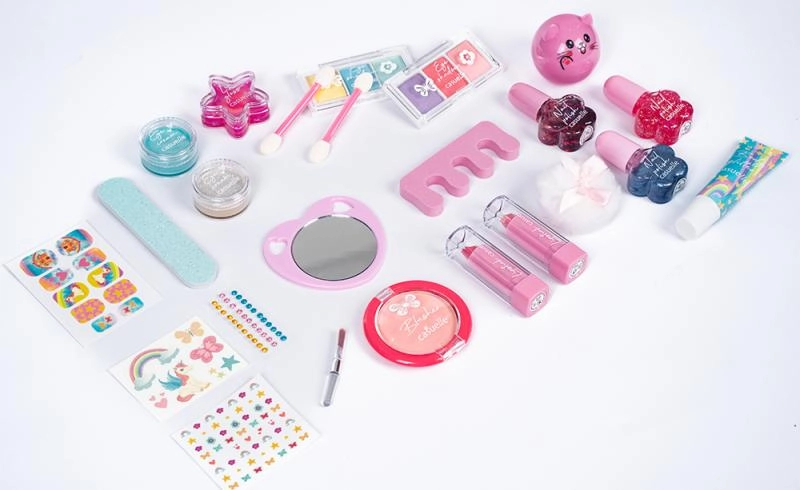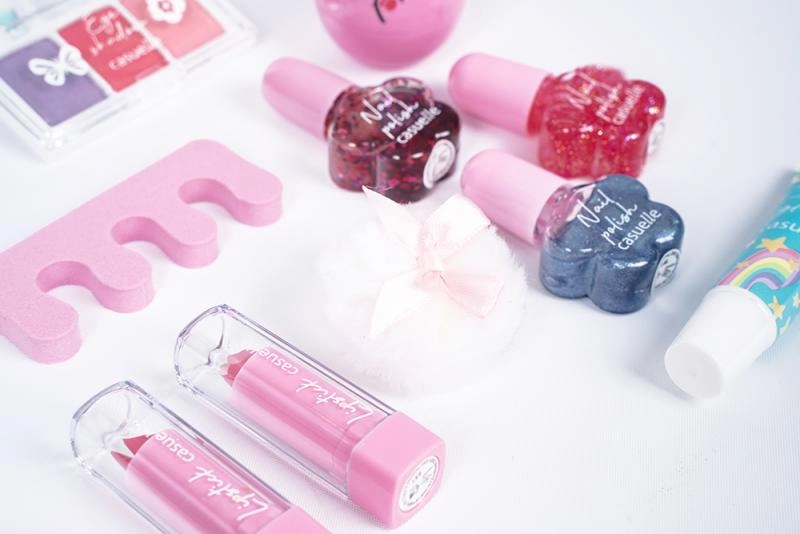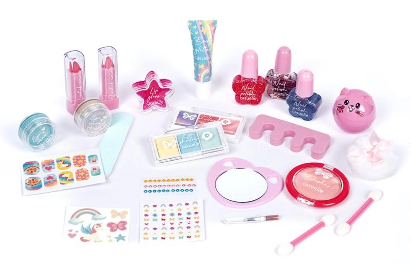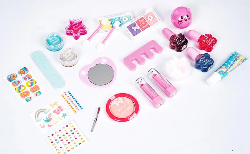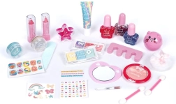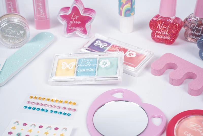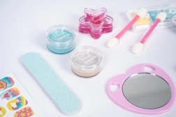 The set supports imagination and fine motor skills. Children can safely try basic makeup and manicure in a colorful, kid-friendly form.