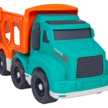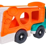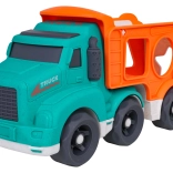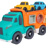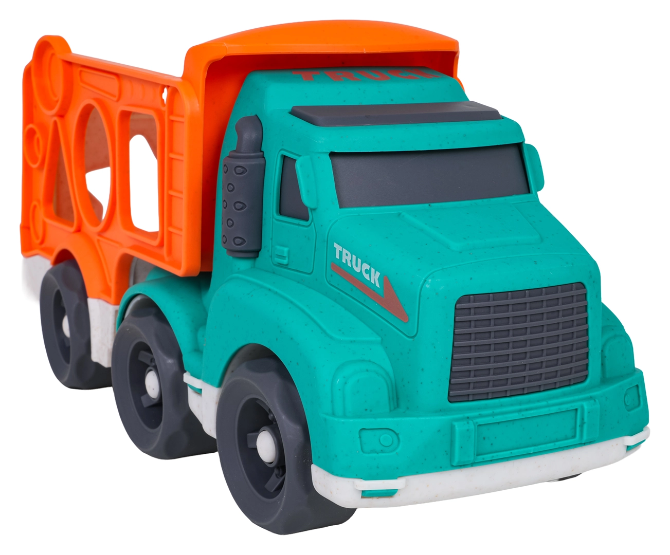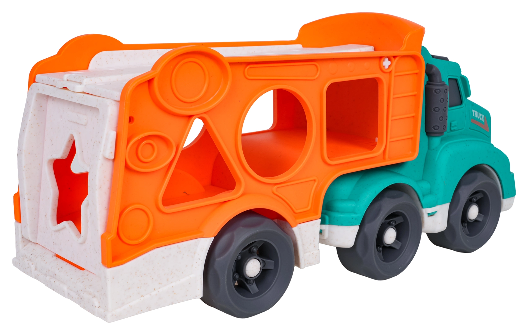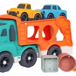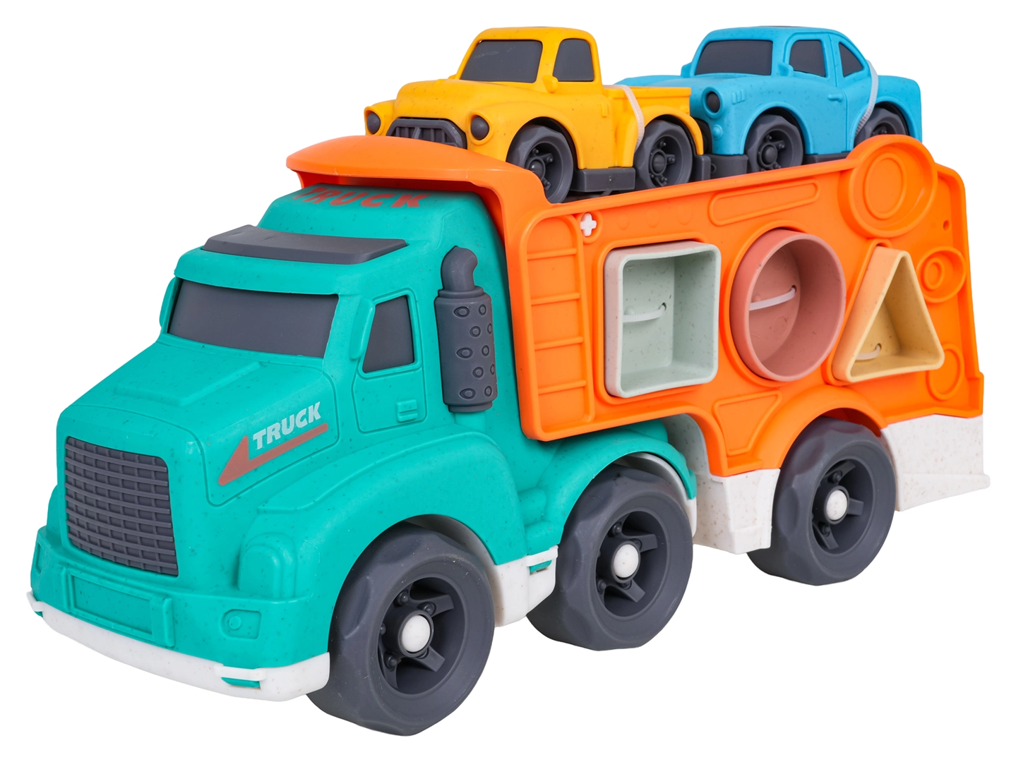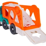 A colorful bioplastic tow truck combines a car carrier and a shape sorter in one toy. Includes 2 toy cars and 4 shapes, features free-rolling wheels, a durable build, and a detachable trailer section. Suitable for children from 18 months, safe and eco-friendly — ideal for indoor and outdoor play.