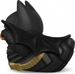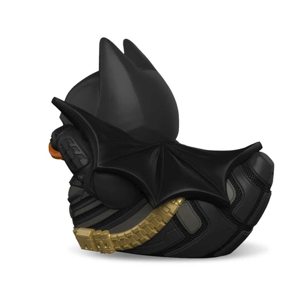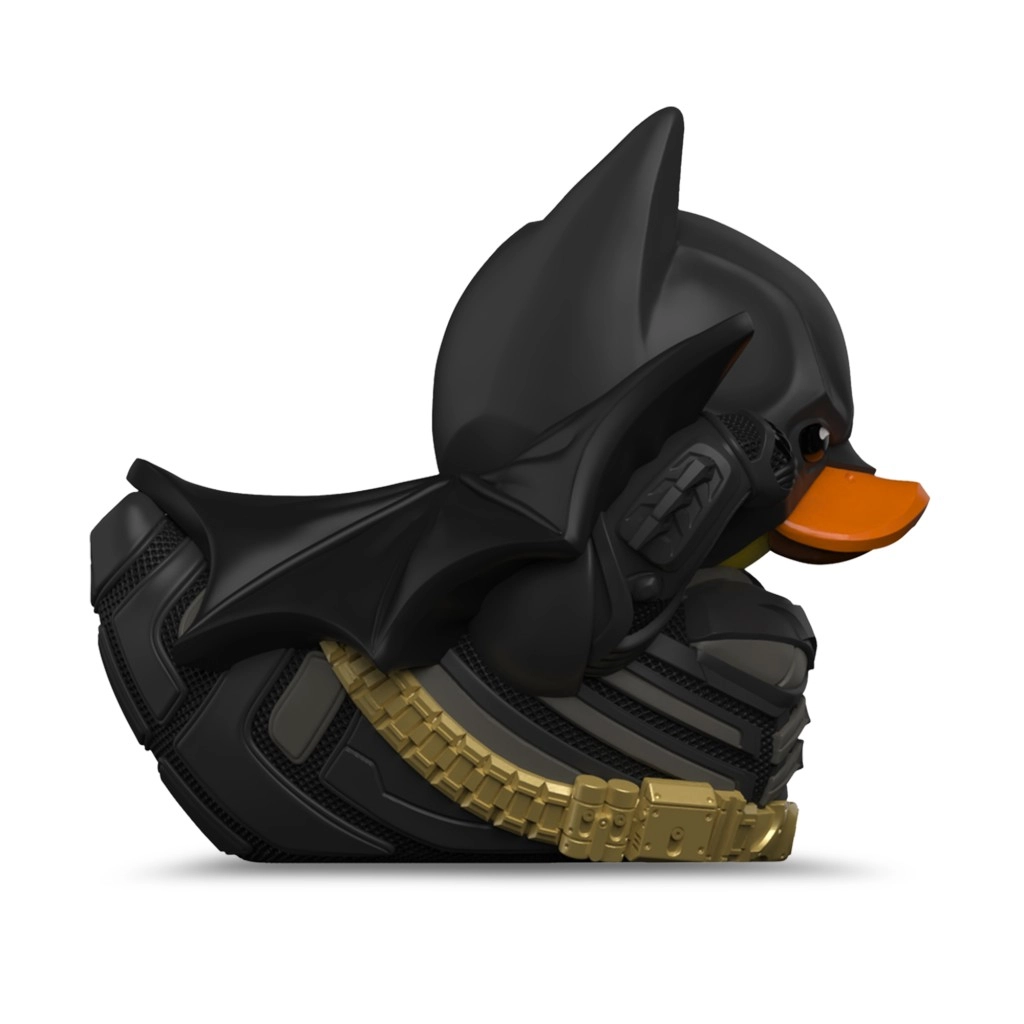 A stylized duck with bat cowl, cape, and gold utility belt. Precise armor sculpting and a matte black finish highlight every detail.