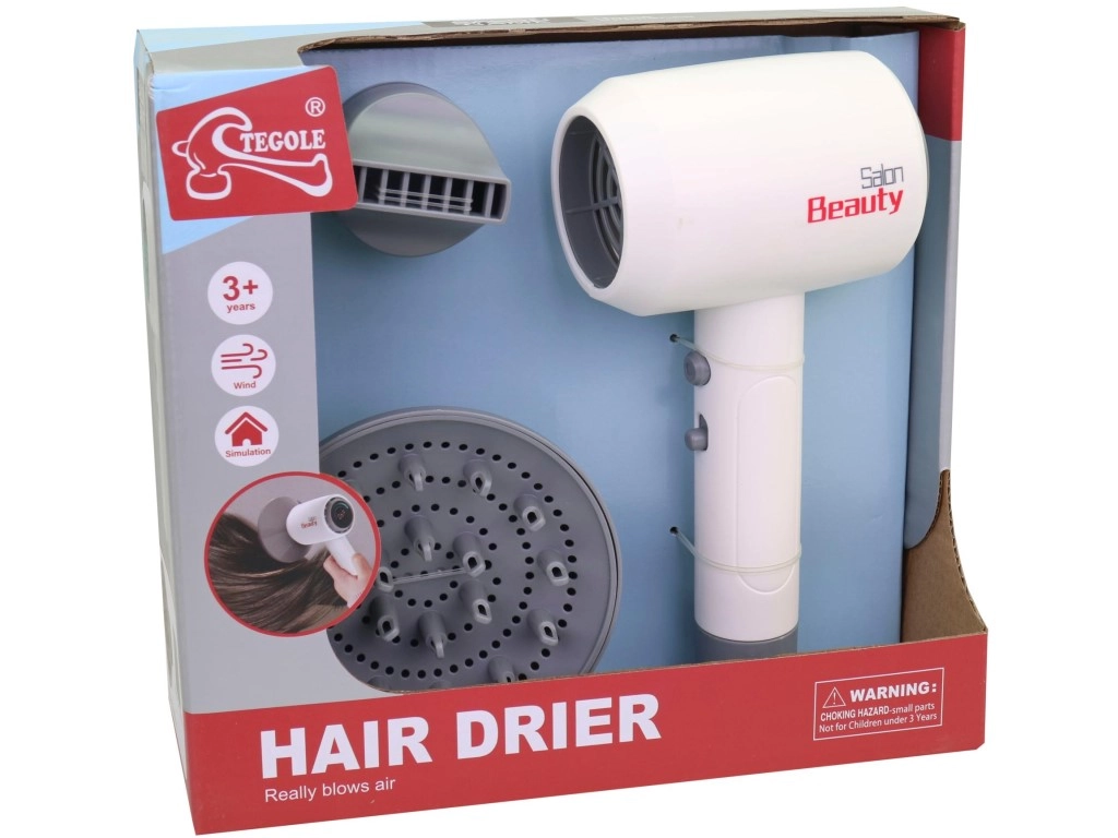 The dryer is lightweight, easy to hold in a child's hand, and ideal for a kids' hairdressing corner. Its safe design and simple controls make it a great gift for children aged 3 and up who want to imitate adults and develop their skills.