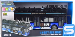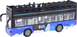 A realistic double-decker city bus in 1:16 scale that will delight children and collectors alike. It offers light and sound effects, a friction drive (pull-back), opening doors, and durable plastic construction in an elegant blue color.