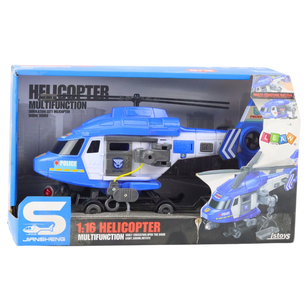 This finely detailed blue police helicopter brings kids plenty of fun and realistic functions. Pressing the buttons activates light and sound effects, the spinning main and tail rotors enhance the authentic feel, and the wheels allow movement across the floor.