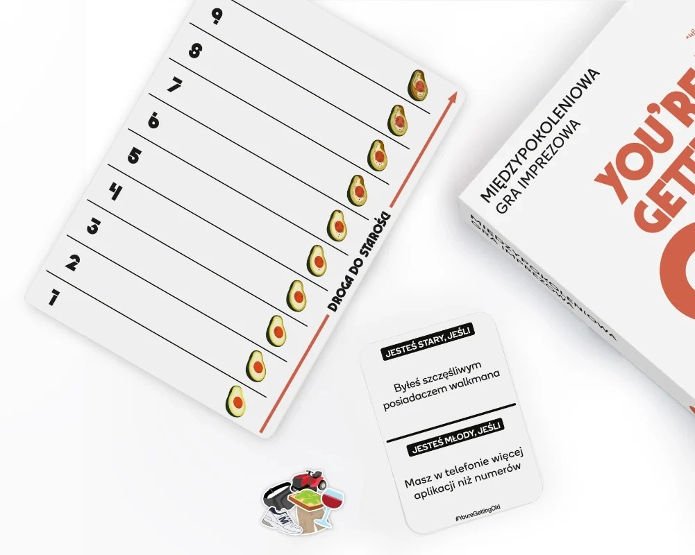 “You’re Getting Old” is a fresh card game that turns any evening with friends into a burst of laughter. Draw cards with statements about what’s “young” and what’s already “old school,” and move forward or backward on the board based on your own reactions. The winner is the one who doesn’t get dragged to the finish and stays as close to the start as possible.