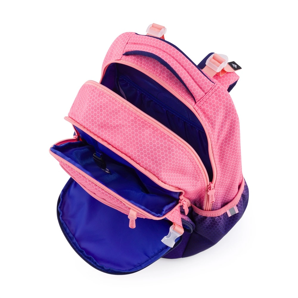 Two large compartments hold textbooks, notebooks, and a pencil case, while the front pocket is ideal for a small snack or keys. Elastic side pockets comfortably hold a water bottle. The reinforced bottom prevents tipping and allows the backpack to stand on its own. Reflective elements improve visibility at dusk and in the dark.