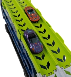 The two-lane fold-out ramp turns the hauler into an action racing set. Perfect for head-to-head duels and fast downhill runs.