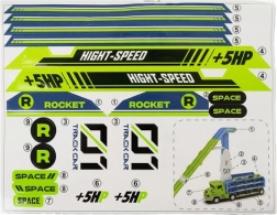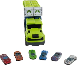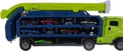 - Truck with trailer and double ramp, 6 die-cast cars, sticker set, manual, colorful gift box, transport carton