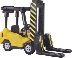 This technical building set brings the world of transport and logistics into the playroom. Build a tractor unit with a flatbed and folding ramps, load the forklift onto the deck, and hit the “road.” The realistic color scheme in dark blue, gray, and yellow together with the included stickers gives the models the authentic look of utility machines.