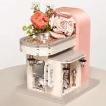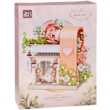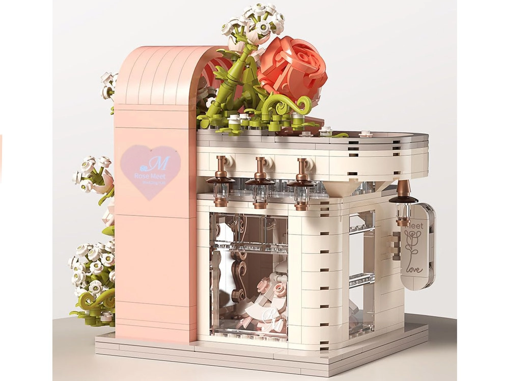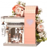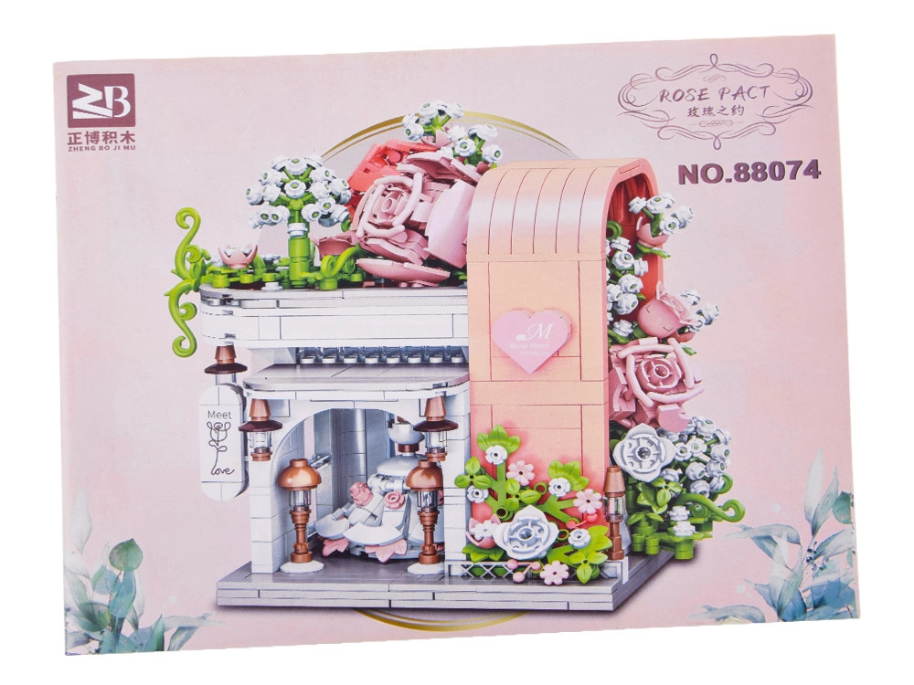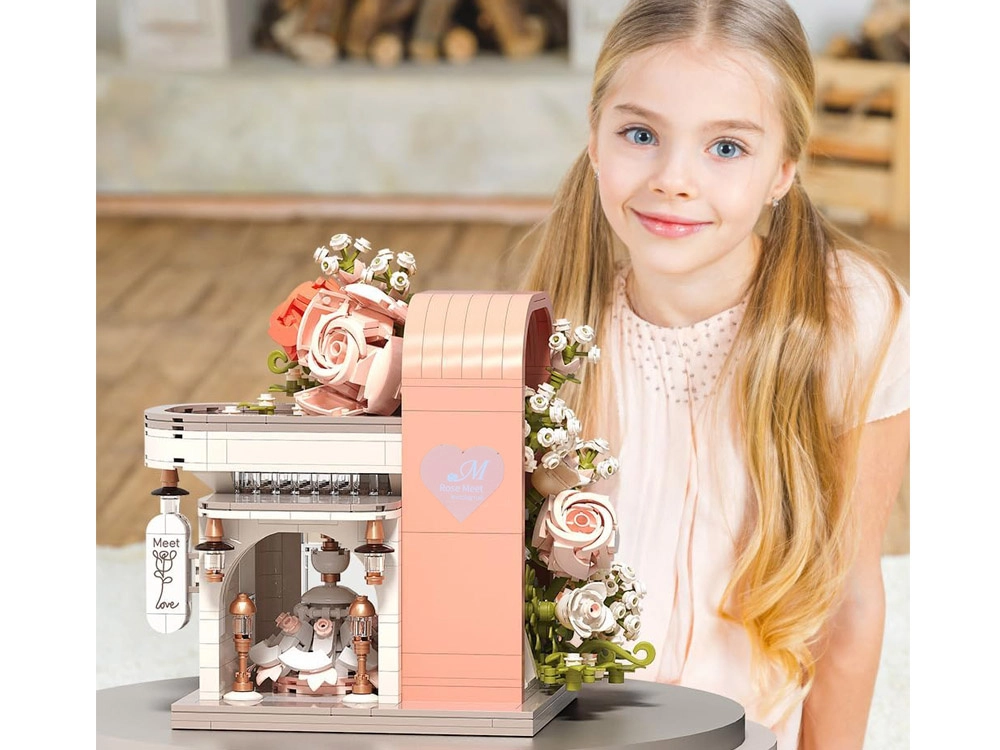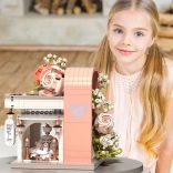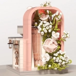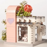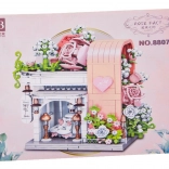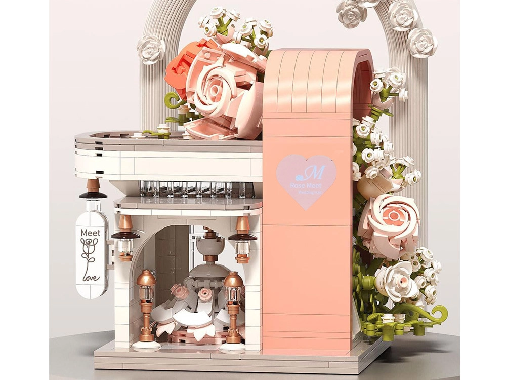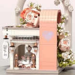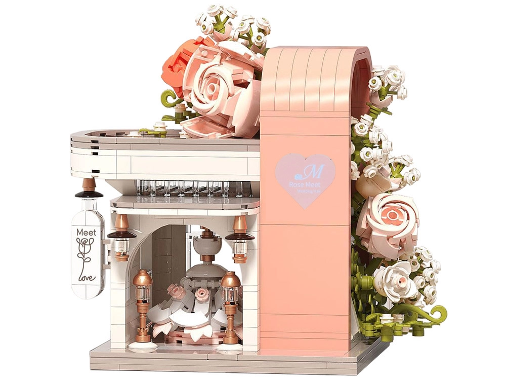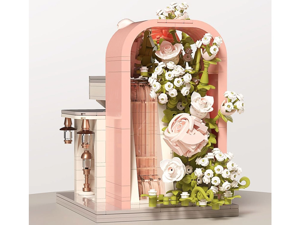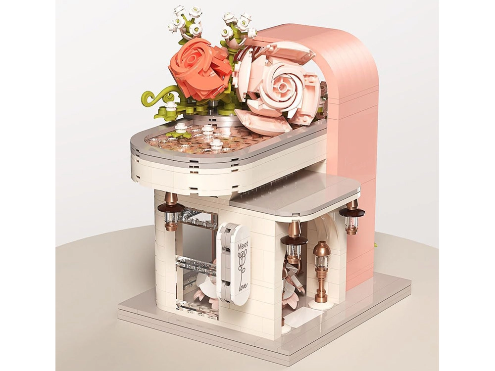 This romantic building set turns your table into a picturesque wedding scene. The elegant storefront with a “glazed” front reveals the star of the show — a wedding dress with subtle pink details that harmonize with white, blush pink, and pastel green. The structure is wrapped in lush floral garlands, roof ornaments, and small entrance lamps, giving the model the charm of a storybook display.