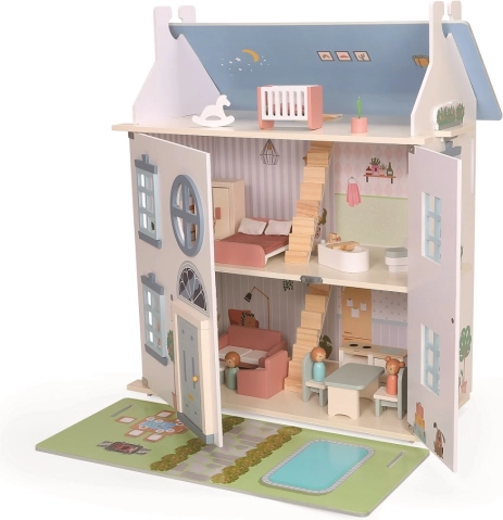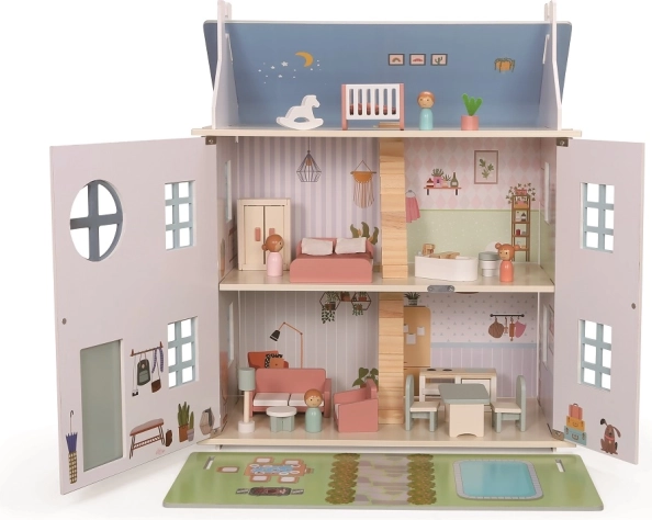 The dollhouse is made of high-quality wood and complemented by textile and felt elements. Furniture and figures are included, so children can start playing right away. Opening panels make it easy to access the interior, and detailed room prints support realistic play. The robust construction ensures long-lasting durability and safe use.