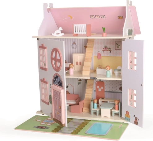 This timeless house made from quality wood will delight little storytellers and design lovers alike. Thanks to three floors and a thoughtfully arranged layout (kitchen, bathroom, living room, bedroom, and an attic kids’ room), it offers the ideal space for family stories and everyday scenes.