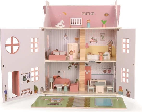 The removable front part of the roof turns, when flipped, into a stylish garden with a pool and furniture — perfect for summer parties or peaceful afternoons by the water. Accessories and dolls are included, so play can start right out of the box.