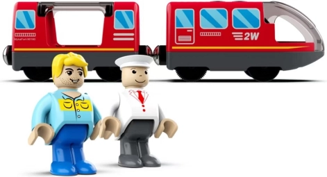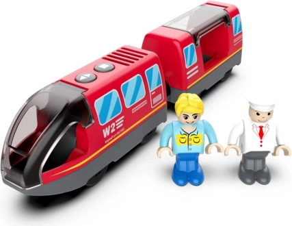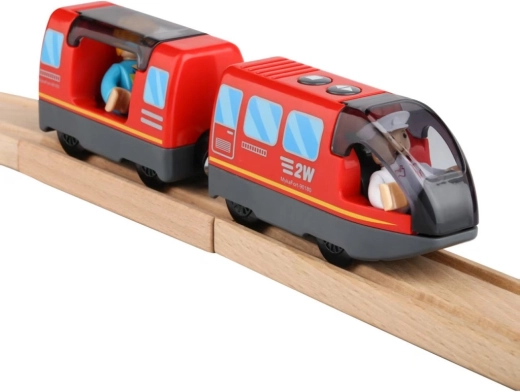A modern red electric train for kids featuring realistic details, battery-powered automatic drive, and magnetic coupling of cars. Includes 2 figures for rich storytelling and is compatible with wooden train sets from common brands. Great for developing fine motor skills, coordination, and imagination.