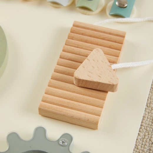 The board is designed for safe daily interaction—with smooth edges, stable wall mounting, and a thoughtfully organized layout of activities. Children practice patience, focus, and movement coordination while naturally developing skills important for preschool age.