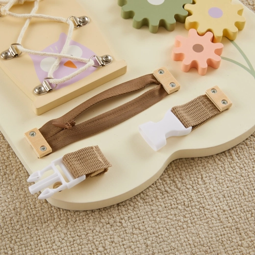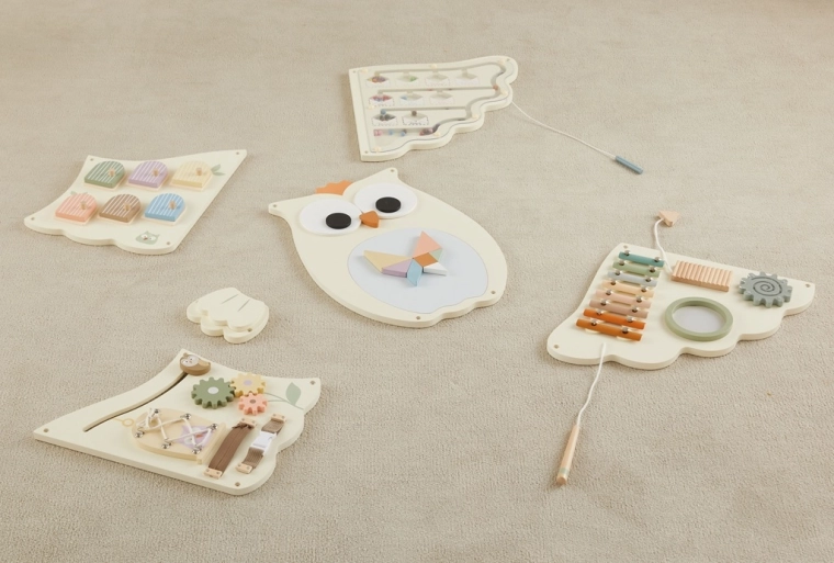 The large wall-mounted motor skills board in the shape of an owl by 2Kids Toys offers children over 10 diverse activities in soft pastel colors. It supports fine motor skills, logical thinking, sensory perception, and hand–eye coordination. Thanks to its quality craftsmanship from wood, plastic, and metal, it is safe, durable, and perfect for a child’s room or playroom.