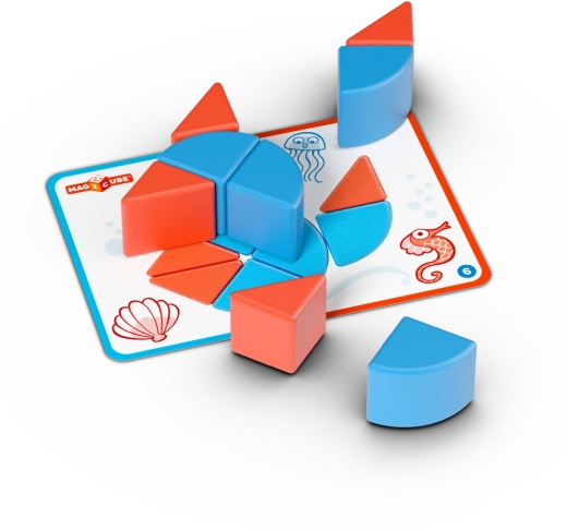 Discover the playful GEOMAG MAGICUBE magnetic construction set for little ones with a total of 16 pieces. 10 magnetic elements and 6 double-sided cards with 12 designs help children easily assemble pictures from simple to more advanced. The templates are at a 1:1 scale for convenient matching. Made from 100% recycled plastic, suitable for children aged 2+, and great for developing imagination and creativity.