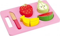 The set includes a cutting board, a wooden knife, and four types of fruit – banana, strawberry, pear, and watermelon. The high-quality wooden design ensures long durability and safe play with no sharp edges.