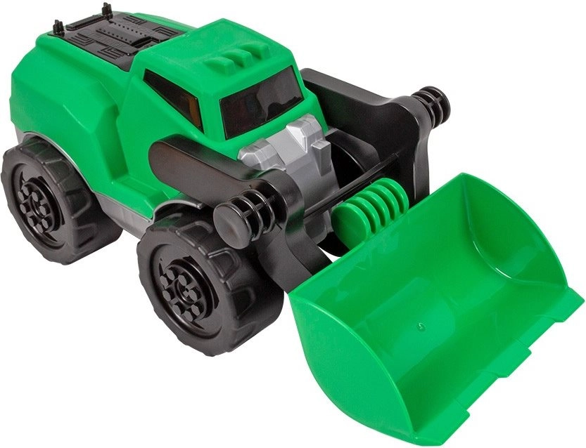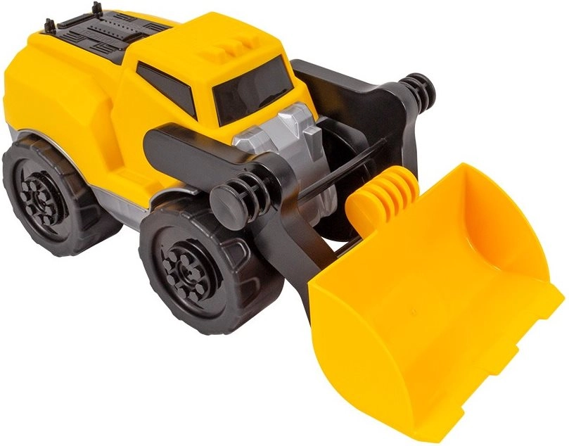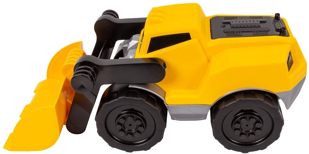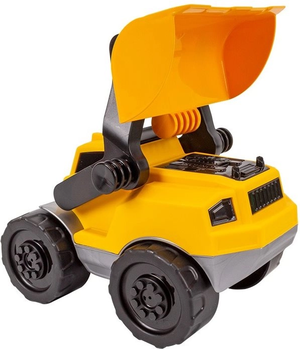 The movable bucket allows scooping and dumping materials, supporting creative and realistic construction play.