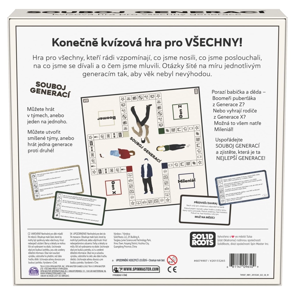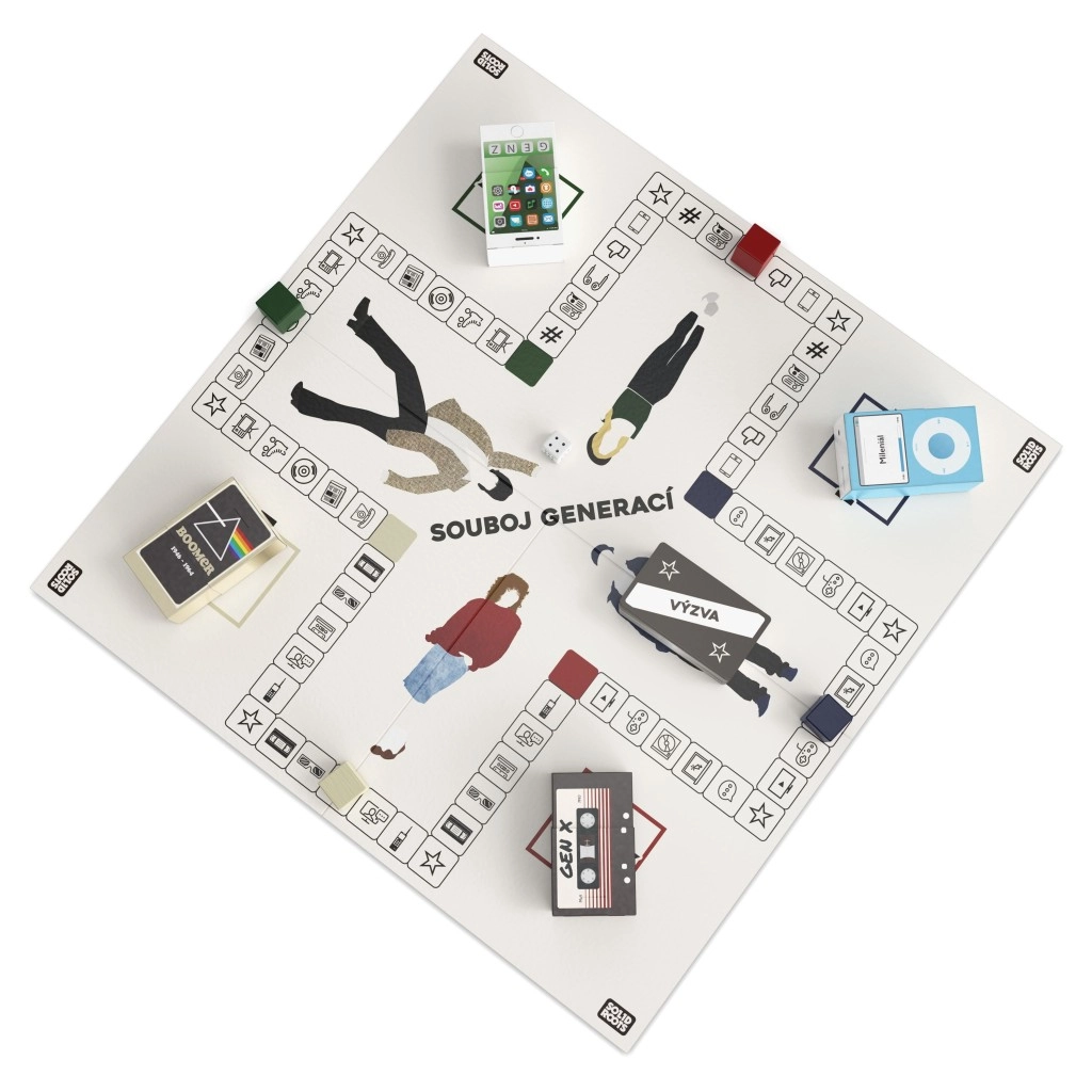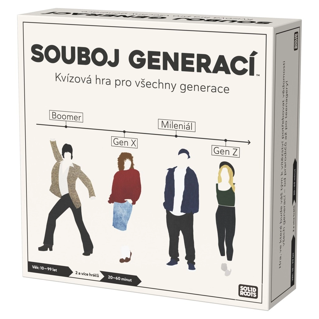 Experience a thrilling knowledge duel across time! This unique quiz game for 2+ players tests your knowledge from the last nearly one hundred years. Questions are split into four eras – Boomer, Generation X, Millennials, Generation Z – and focus on history, culture, advertising, fashion, and trends. Play solo or in teams, and the Challenge cards will put your wits and skills to the test. Perfect family and party game lasting 20–60 minutes, for ages 10+. Czech market only.