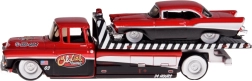 The CHEVROLET Flatbed 1957 tow truck is equipped with a detailed loading ramp that faithfully replicates the transport of a classic car.
