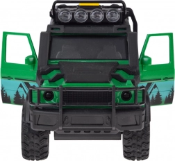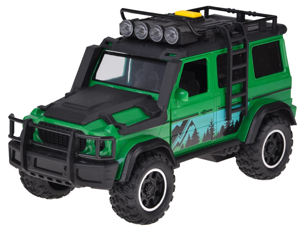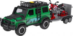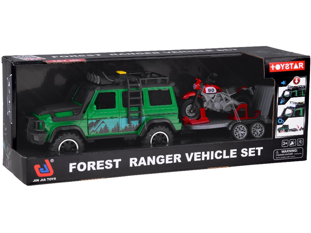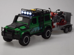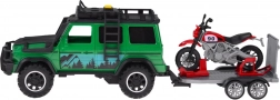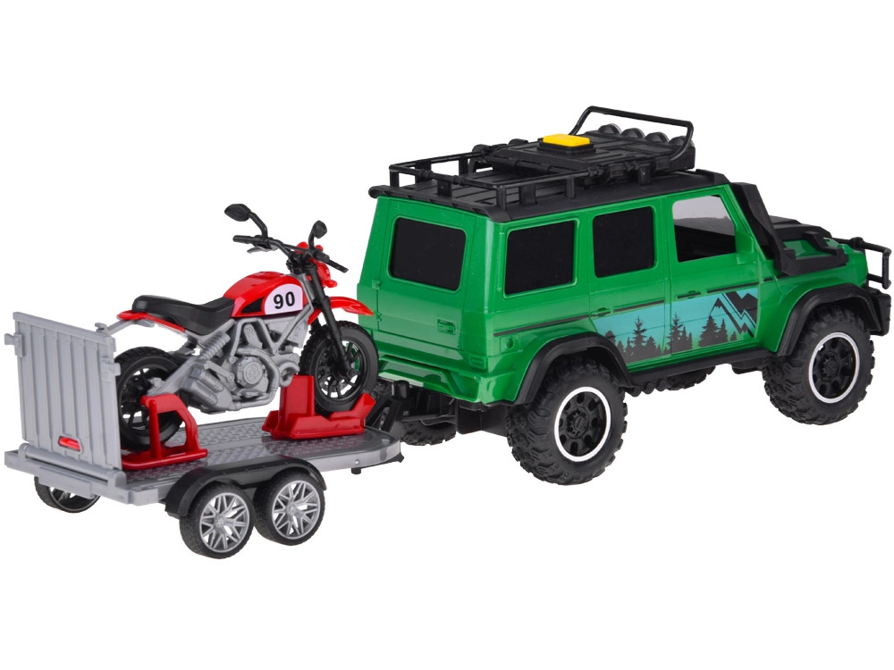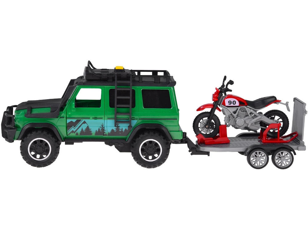 Head off-road! This detailed set combines a green SUV with rugged tires and a roof rack with a practical trailer for transporting a motorcycle. Realistic light and sound enhance the atmosphere, while opening front doors and rubber rotating wheels ensure plenty of fun and smooth movement across the floor.