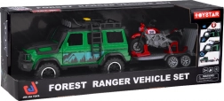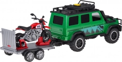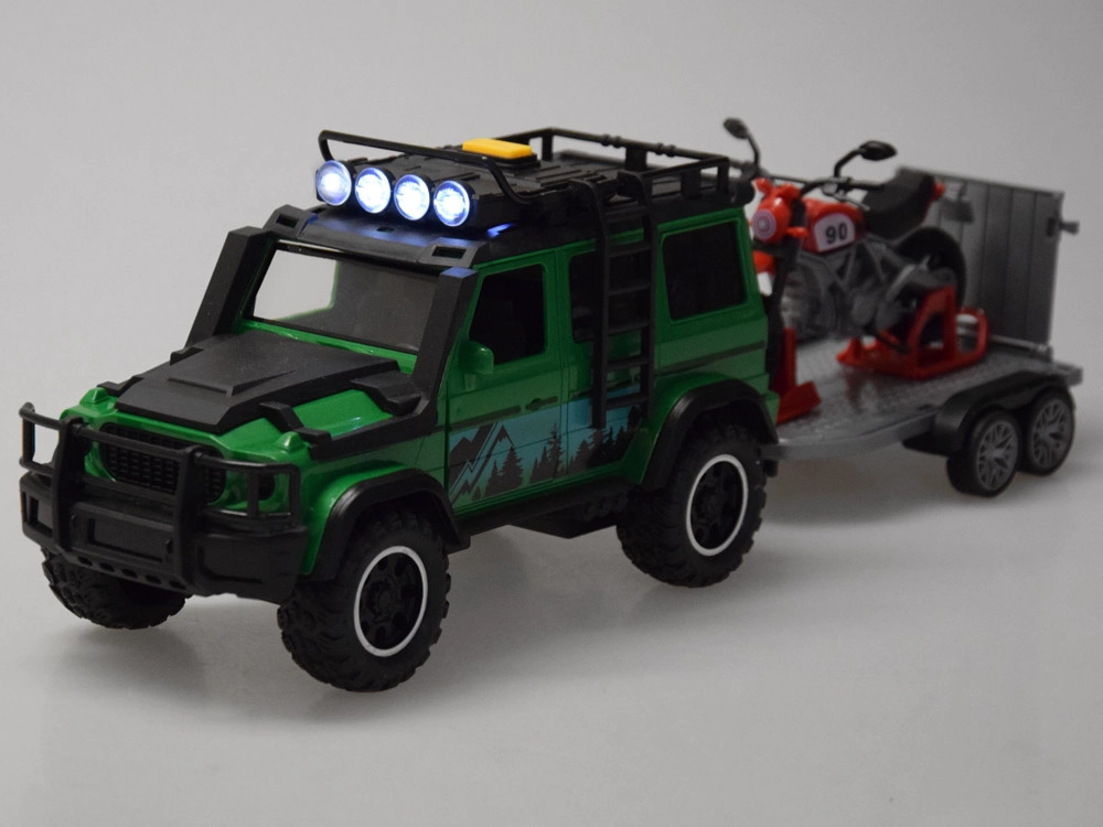An adventurous set for young drivers: a green off-road car with a detachable flatbed trailer and a red sports motorcycle. The car features light and sound effects, opening doors, and rubber wheels for smooth driving. The trailer has a fold-down rear ramp for easy loading and safe transport of the motorcycle. Ideal for creative play and transporting other favorite toys.