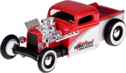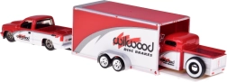 A stylish 1:64 scale collector set featuring the iconic CHEVROLET 454 SS Pick-up 1993 and the classic CHEVROLET Pick-up 1936 on a transport trailer. The red-and-white models feature a metal body, rubber tires for smooth rolling, and detailed tampo prints. The 454 SS pick-up comes with a removable tow hook, and the trailer can be easily attached and detached – perfect for play or display.