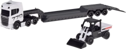Discover the realistic SCANIA 770S set with a low-loader trailer and a functional loader, featuring faithful detailing and an attractive white–gray color combination. The metal cab shell and quality plastic chassis parts ensure durability even with frequent play.