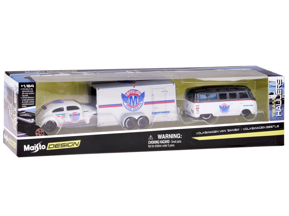 Discover the timeless design of classic cars with Maisto’s precise craftsmanship. Finished in an elegant white–silver scheme, the set features metal bodies, plastic chassis for lightness, and smooth rolling on different surfaces thanks to rubber tires. The Beetle fits comfortably on the included trailer, letting you enjoy both authentic transport and an impressive display piece.