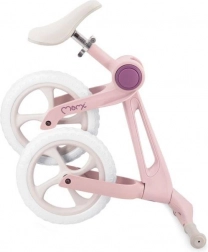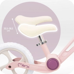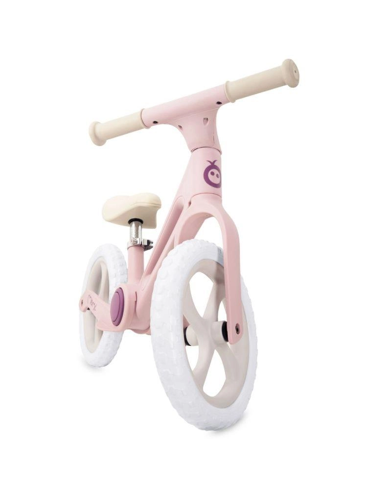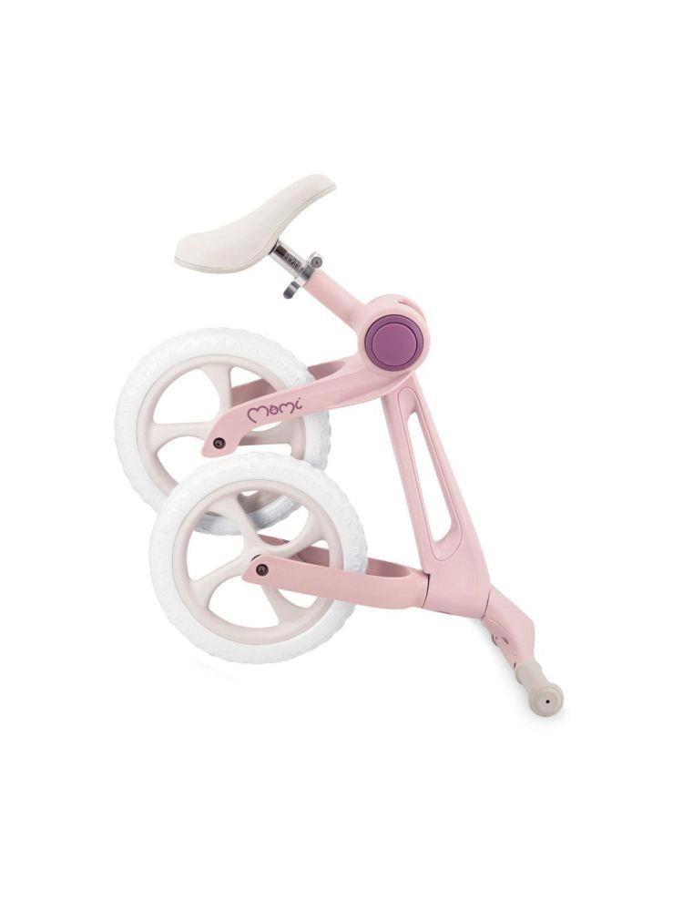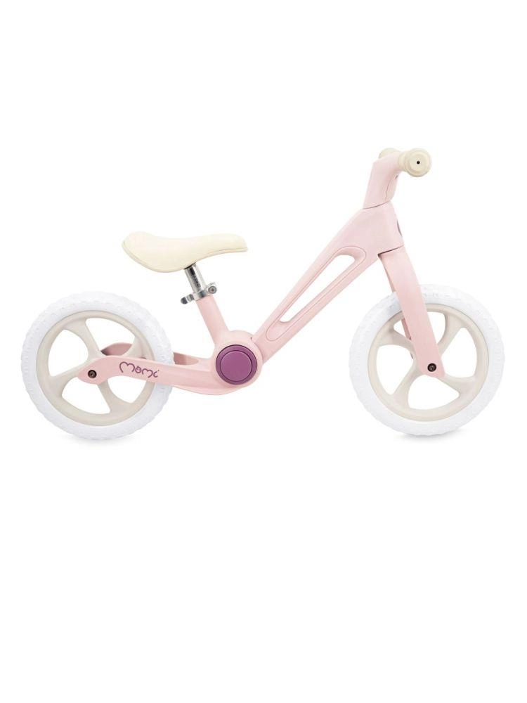 The lightweight and compact MoMi Noru balance bike in a stylish pink color helps children from 2 years develop balance and confidence while riding. Thanks to the one-button folding frame, 12" tubeless EVA foam wheels, and tool-free quick saddle height adjustment, it’s ideal for travel and everyday fun. Non-slip grips and a durable nylon frame ensure comfort and safety.