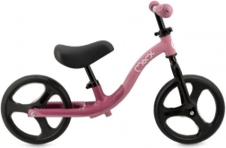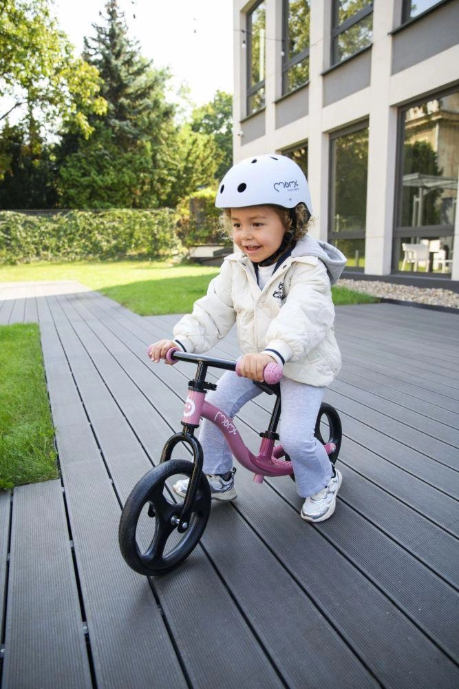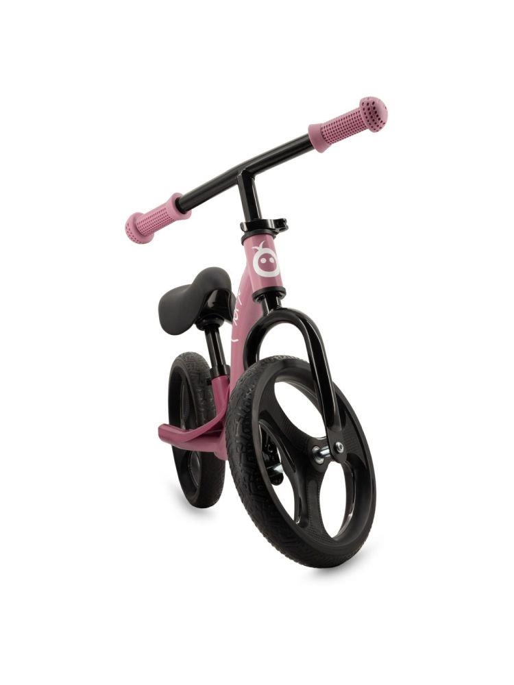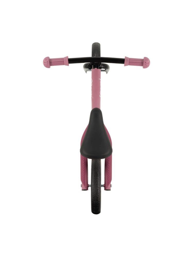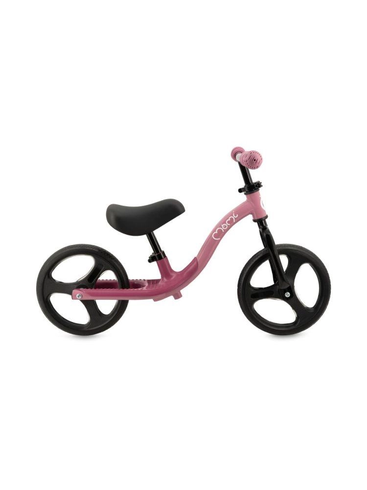 The lightweight MoMi Isoka balance bike in pink helps children from 2 years develop balance and coordination. It offers battery-free LED lights in the wheels, tool-free saddle and handlebar height adjustment, TPR wheels for a comfortable ride, and a safe design without a steering lock for better handling.