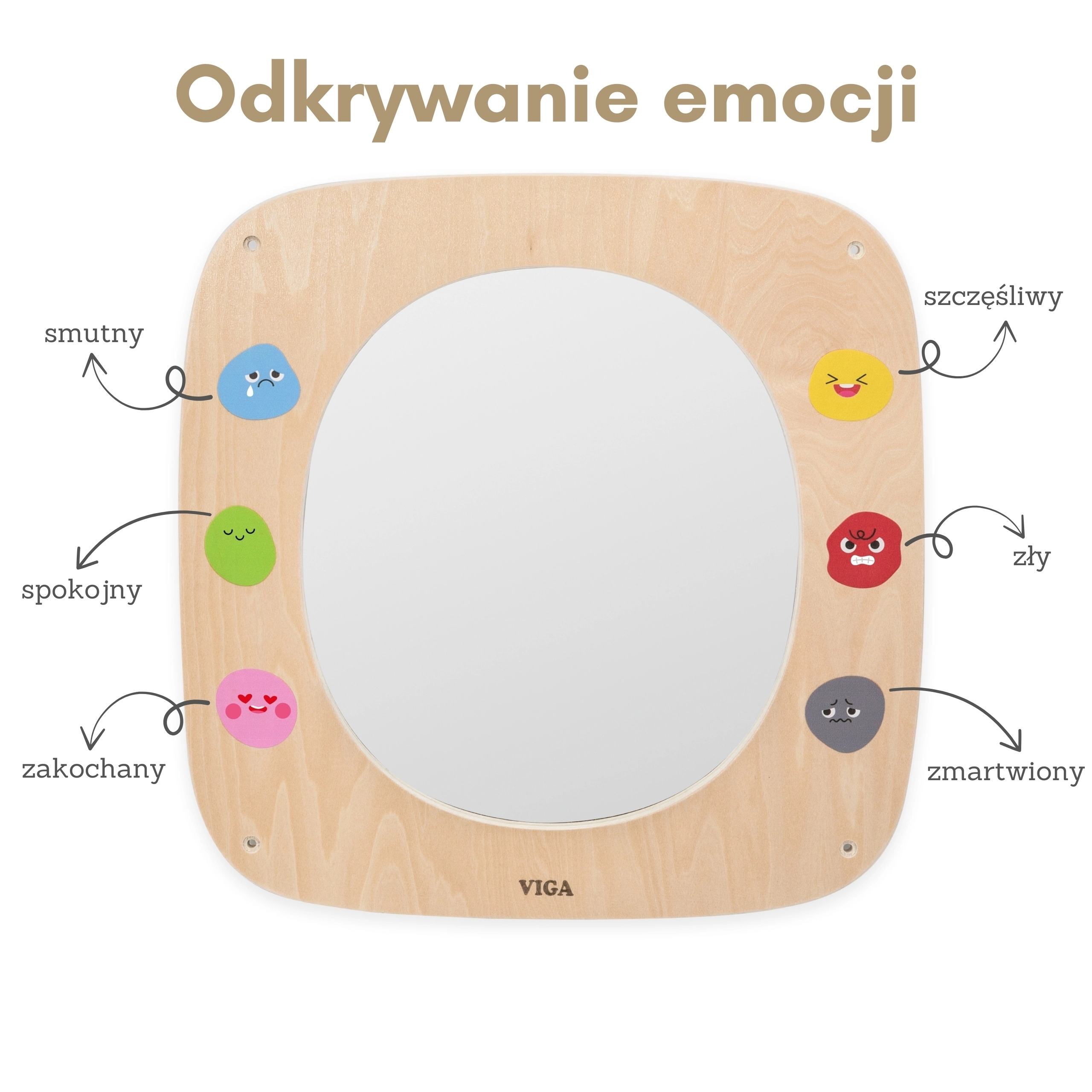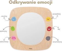 The VIGA wooden mirror board is ideal for kids' rooms, preschools, and play corners. The large safe mirror with a clear frame helps children explore their own expressions, imitate facial movements, and learn to distinguish emotions. The colorful emojis around the frame inspire conversations about feelings and naturally foster emotional intelligence.