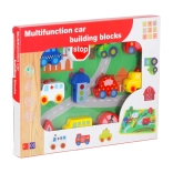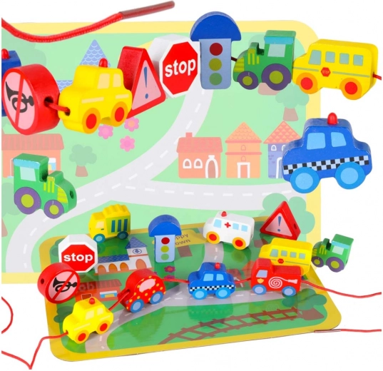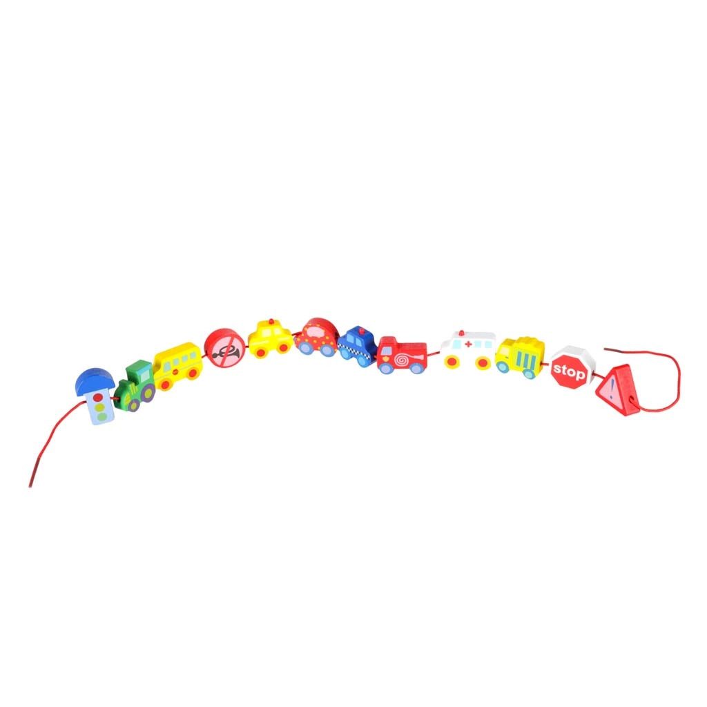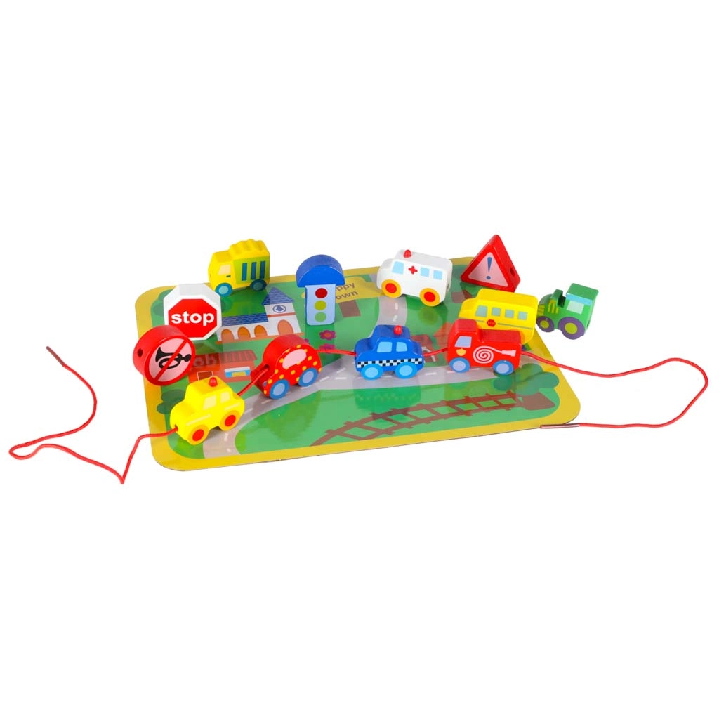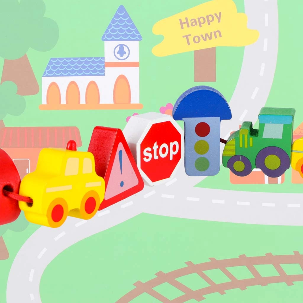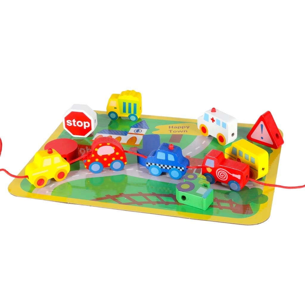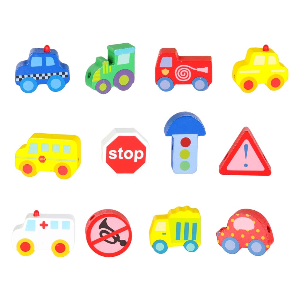 Solid, smoothly finished blocks in the shape of vehicles and signs are easy to grasp, and thanks to their through-holes they slide onto the string with ease.