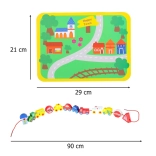 This creative set combines lacing wooden blocks with open-ended play on a “little town” mat. Children practice grip, movement precision, and patience while getting to know cars, an ambulance, a bus, the police, and traffic signs. The pieces are smoothly finished, pleasant to the touch, and colored safely.