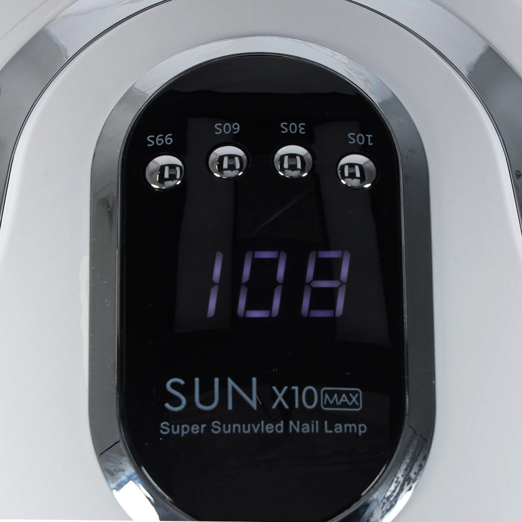 Powerful UV/LED Nail Lamp SUN X5 with 150 W and 45 LEDs cures gel polishes, gels, and acrylics quickly and evenly. It offers a 10/30/60/99 s timer with a low heat mode, a motion sensor for automatic activation, and universal dual wavelengths 365 + 405 nm for perfect results in both manicure and pedicure.