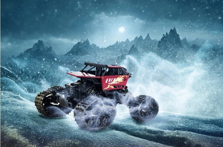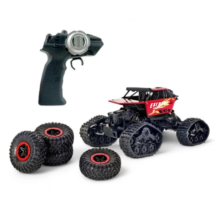 With all-wheel 4×4 drive and interchangeable wheels or tracks, the car handles various surfaces—from carpets to gravel or grass. The modern 2.4 GHz controller provides a stable, interference-free connection, ideal for solo or group driving.