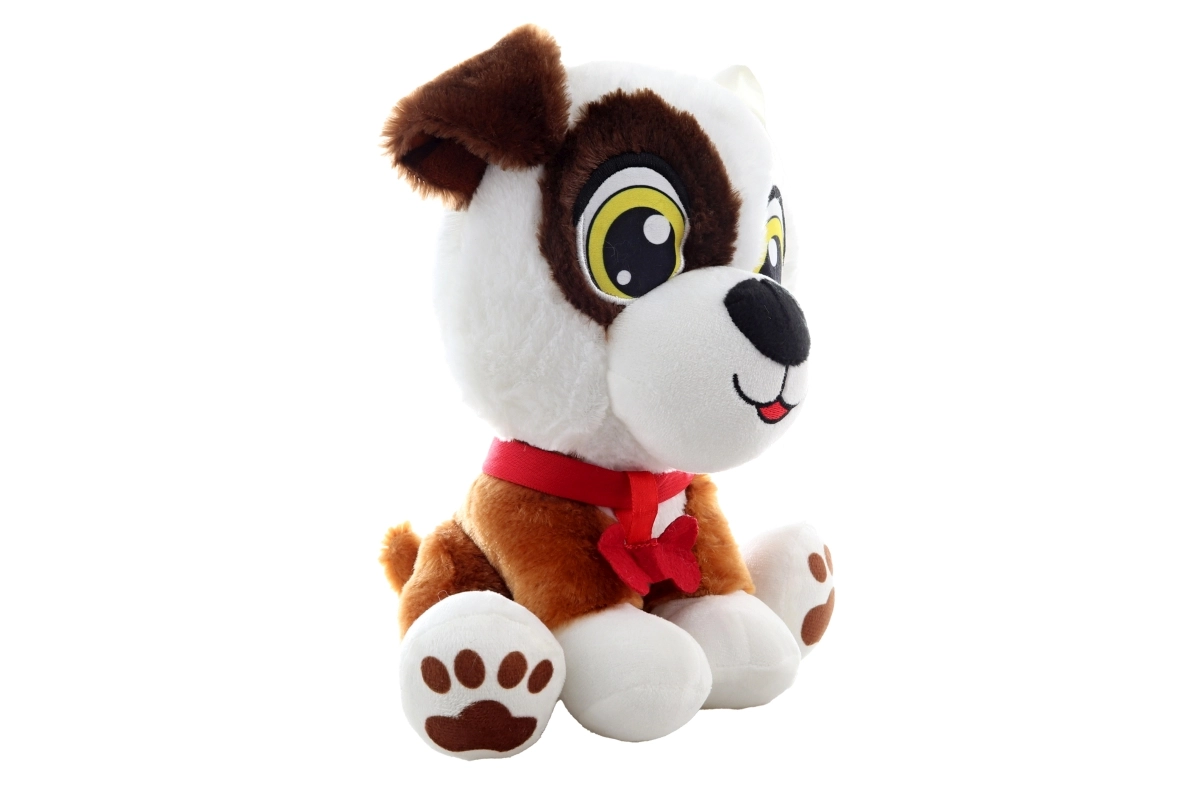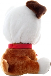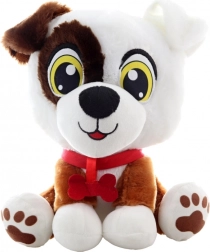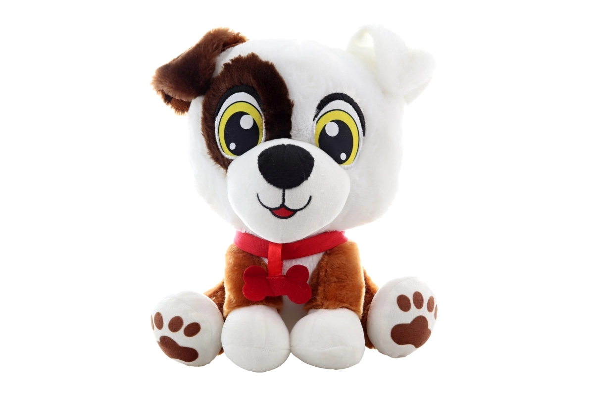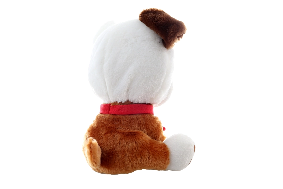 This soft plush puppy in a white and brown color combination is made for hugs. It features embroidered facial details, printed paw pads, and a red collar with a bow and bone, giving it a friendly, playful look. It’s safe for the youngest children and fits perfectly in a crib or a kid’s room as a decoration.