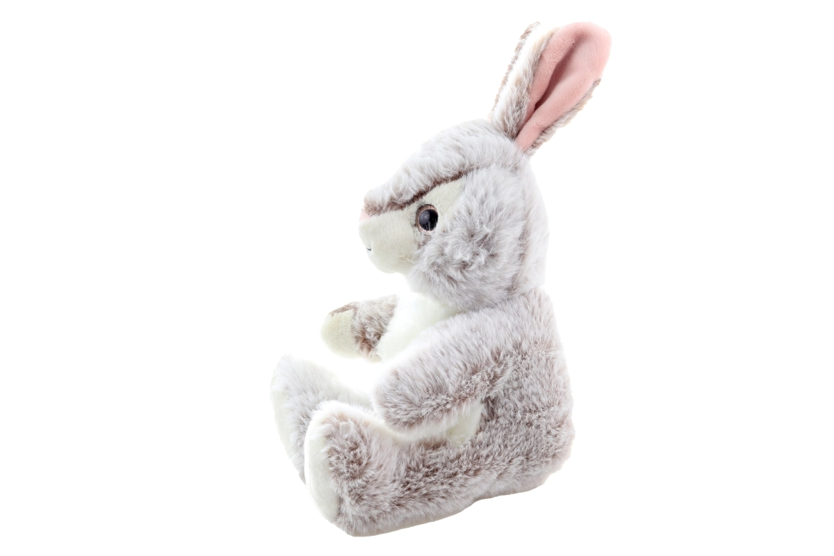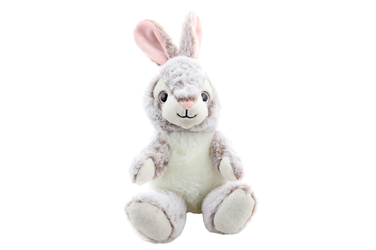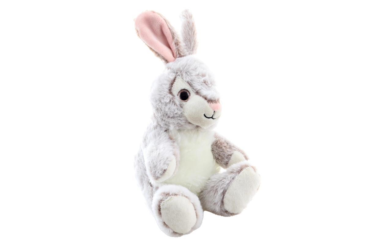 A cute plush bunny with an ultra-soft fur coat, perfect for cuddles and peaceful sleep. It features soft grey-and-white fur, pink ears, and embroidered details for maximum safety from age 0+.