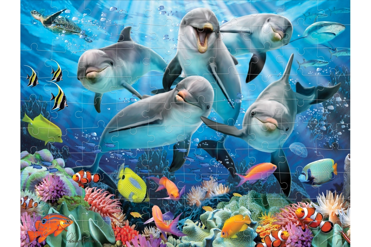 The special surface creates depth and motion, making the dolphins look like they are swimming right in front of you.